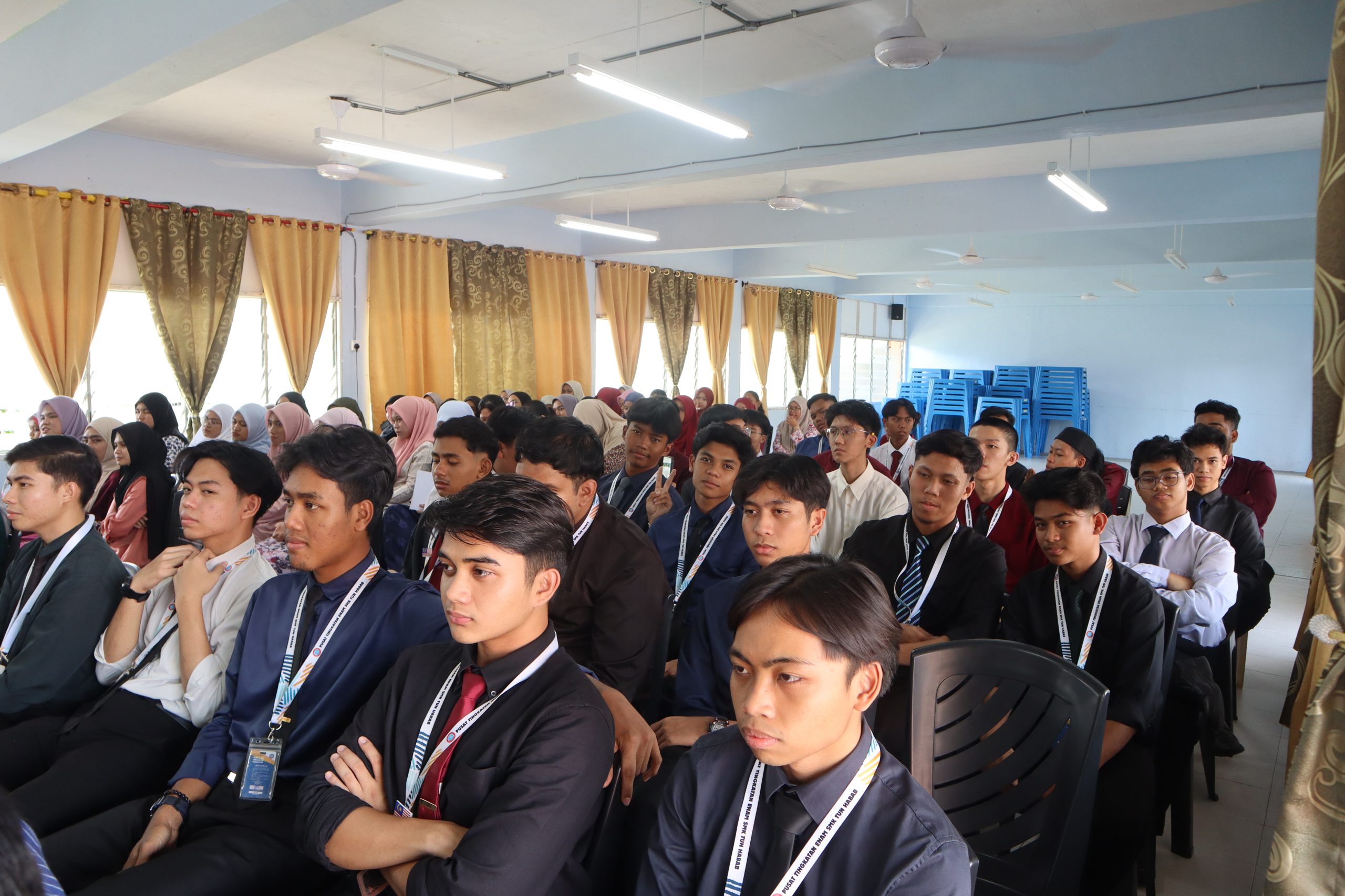 Semua guru dan pelajar Tingkatan 6 bersama-sama meraikan kehadiran beliau dengan diiringi oleh pengetua SMK Tun Habab, Tuan Haji Khairuddin bin Mustapha dan Penolong Kanan Tingkatan 6, Encik Saharudin bin Abdullah.